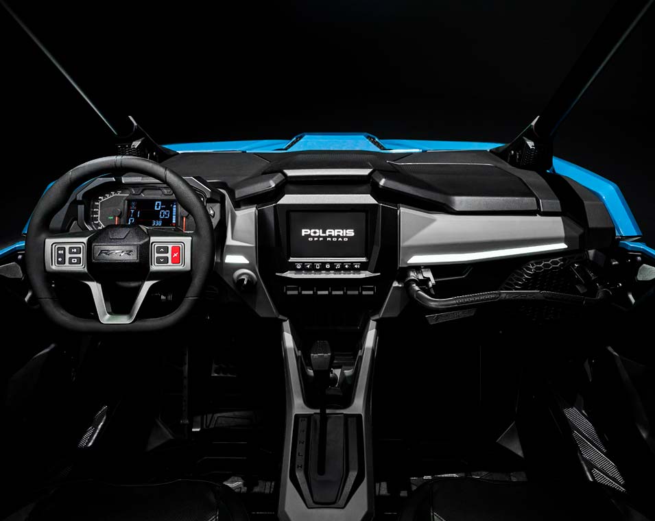- Signature RZR Fang-Akzentbeleuchtung; weiße LED-Abblend- und Fernlichter sowie rote LED-Rück- und Bremslichter; animierte Innenraumbeleuchtung